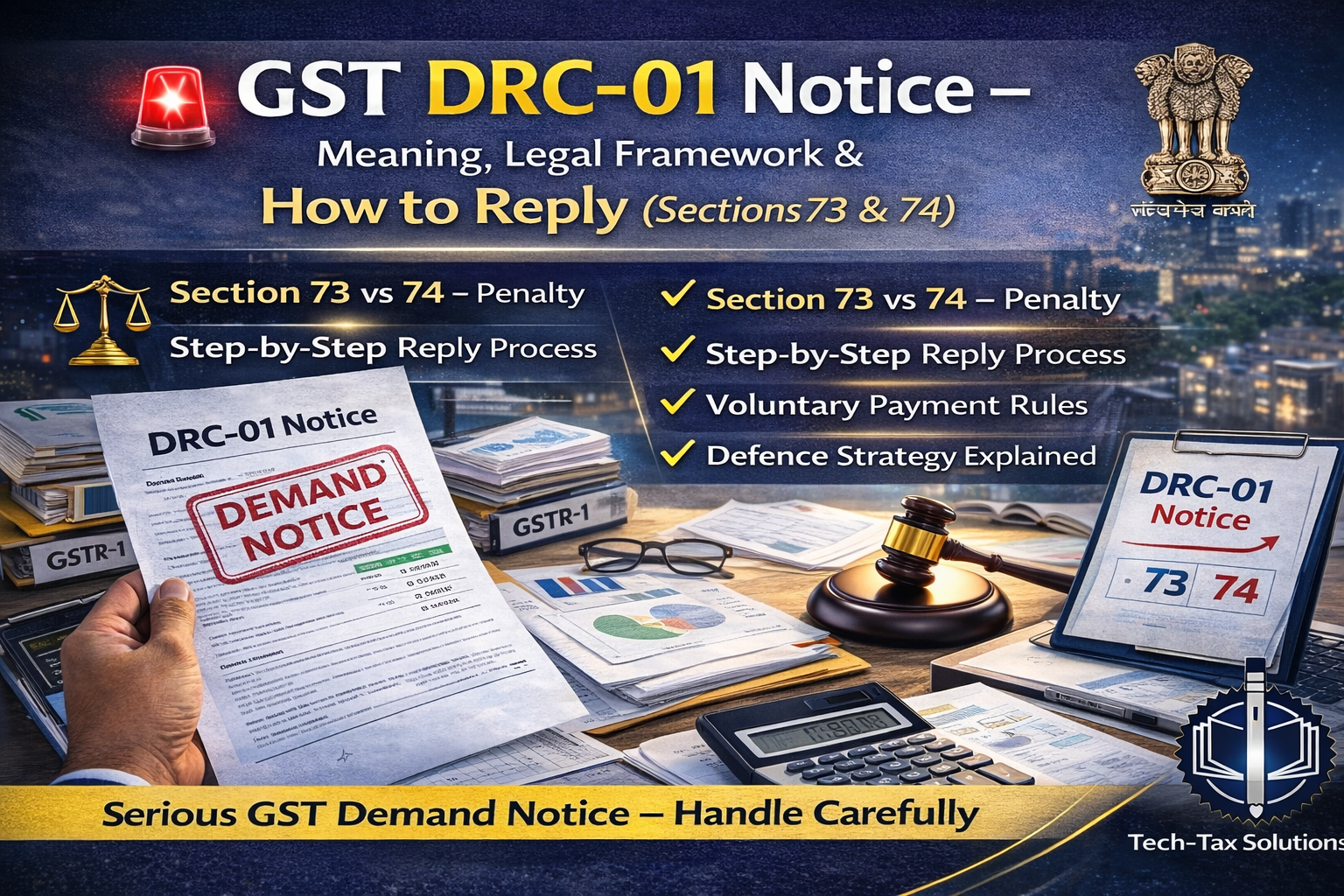 Received GST DRC-01 notice? Understand its legal basis under Sections 73 & 74 of CGST Act, updated penalty structure, limitation period, voluntary payment options, and reply strategy (2026 position).